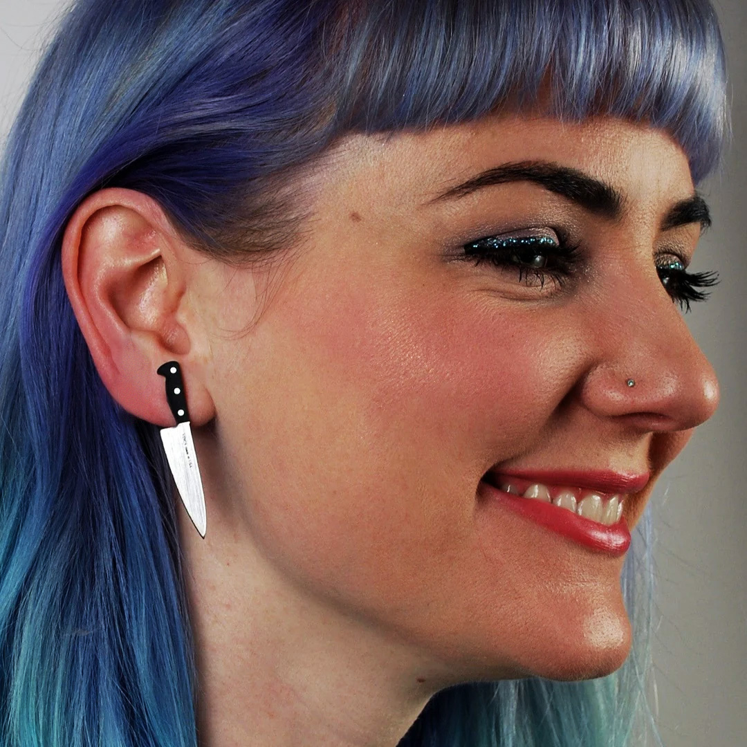 Jewellery for dark romance lovers! This pair of 2″ Chef’s Knife stud earrings are cut from two-layer silver tone/black acrylic (plastic) with a surgical steel post. They’re not sharp, but that being said, it is not recommended that you sleep or shower with these knives!