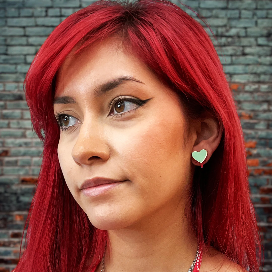 These Heart Melt earring studs are cut from mirror gold plastic with a solid red plastic back plate. Charm is attached to a surgical steel post.
